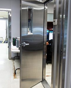 Stainless hollow metal frames are formed of either 16, 14, or 12-gauge in Type 304 or 316 stainless, No. 3, 4, or 2b mill-finish stainless steel. Profiles are CNC brake press formed. We assemble head and jambs with a tab-and-slot arrangement to ensure accurate alignment of miters. We weld all exposed face joints and grind them smooth to produce an invisible joint maintaining the original finish. Continuous throat weld is available on frames, side lites, borrowed lites and windows.